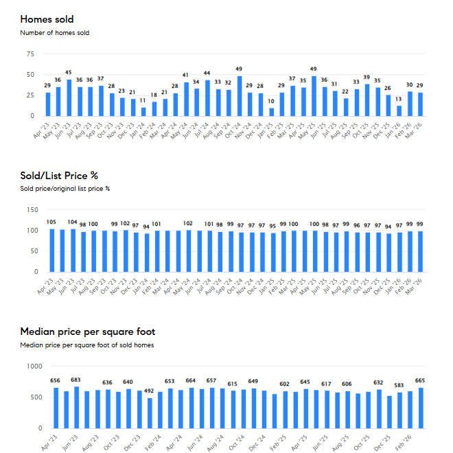 #1. The number of homes which sold in March of 2026 were 29, this is only one less sale than what occurred in February. #2. The original list price to final sales price ratio is at 99%, meaning on average homes are selling under their original listed price. We were at 99% in February of this year too. We have been under 100% for the last 10 months beginning in June, just after the spring market ended. We saw San Rafael hit 100% in February and March, the activity level in Novato is suggesting Novato hits 100% or better in April #3. The median price per square foot of sold homes in March was $665, up from $603 in February of 2026. The median price per square foot sold has been trending up since December.