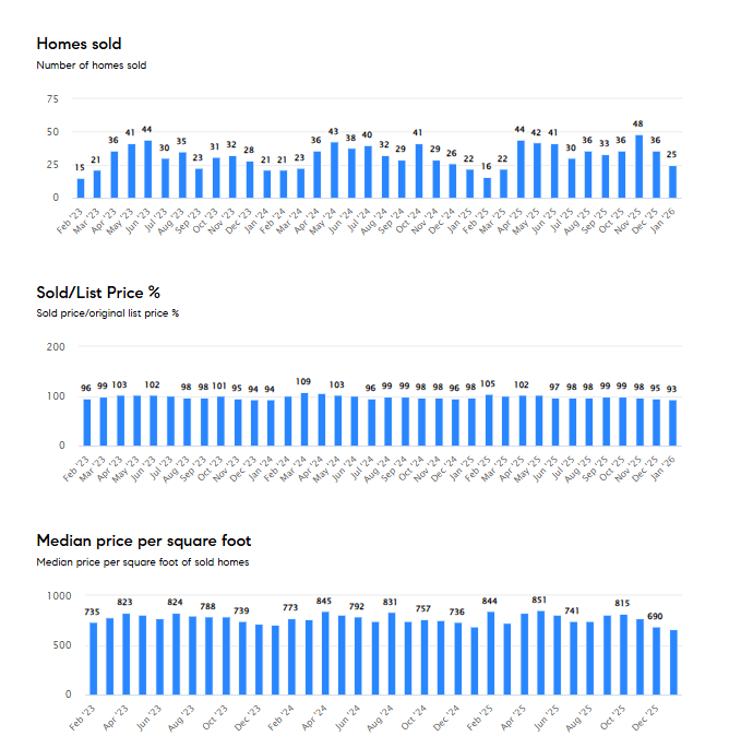 The January 2026 real estate market report for San Rafael, California. The following are the key points: #1. The number of homes sold in January was 25 which was a decrease month over month of 31%, but year over year increased by 14%. Please be aware that January and February are the months historically with the fewest sales. Also worth noting, agents are still commenting on how we saw an increase in buyers interest between Thanksgiving and New Years, pretty much unheard of. #2 The median days on the market was 34 days, a decrease of 55% month over month, and a decrease of 17% year over year. December and January are the months that see longer days on market typically, but this year January bucked the norm. We saw 2 homes sell in less than 30 days. Additionally we saw four homes sell off market with two of these receiving multiple offers and of these, three had been listed before but pulled off the web for the holidays. #3. The original list price to final sales price ratio was 93%, it has been below 100% for eight months now. #4. The median price per square foot in January of 2026 was $662, down from $690 in December of 2025, and $767 in November of 2025.