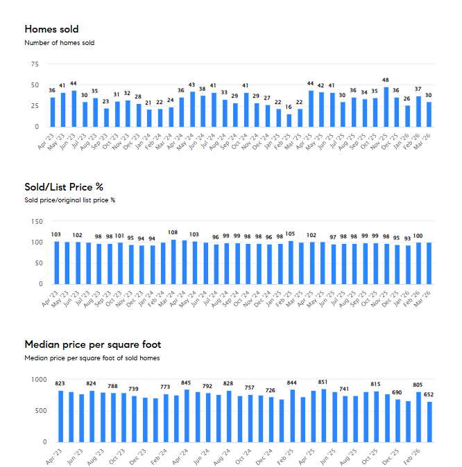 The March 2026 real estate market report for San Rafael, California. The following are the key points: #1. The number of homes sold in March was 30, down from February’s 37. #2 The median days on the market was 12 days down from February’s 22. #3. The original list price to final sales price ratio was 100%, it had been running below 100% beginning in June of 2025 and running through January of this year. #4. The median sold price per square foot in March 2026 was $652, but last month was $805, however, setting aside February we had been experiencing a downward trend since October of 2025 when we were at $815.